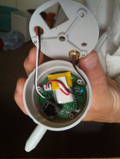 Connect the u.FL to SMA connector and the battery to the main board. Put some double sided tape on the battery to stop it moving about. Mount the SMA connector through the previously drilled hole, and route the solar panel connector through its hole. Re-attach the bottom of the wind vane, routing the thermistor through its hole.