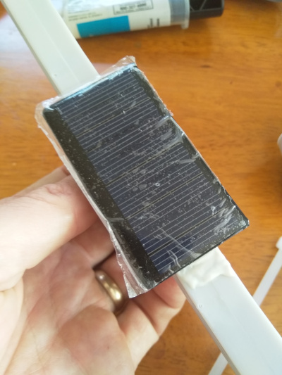 I use epoxy to glue the solar panel on to the cross bar between the wind vane and the anemometer